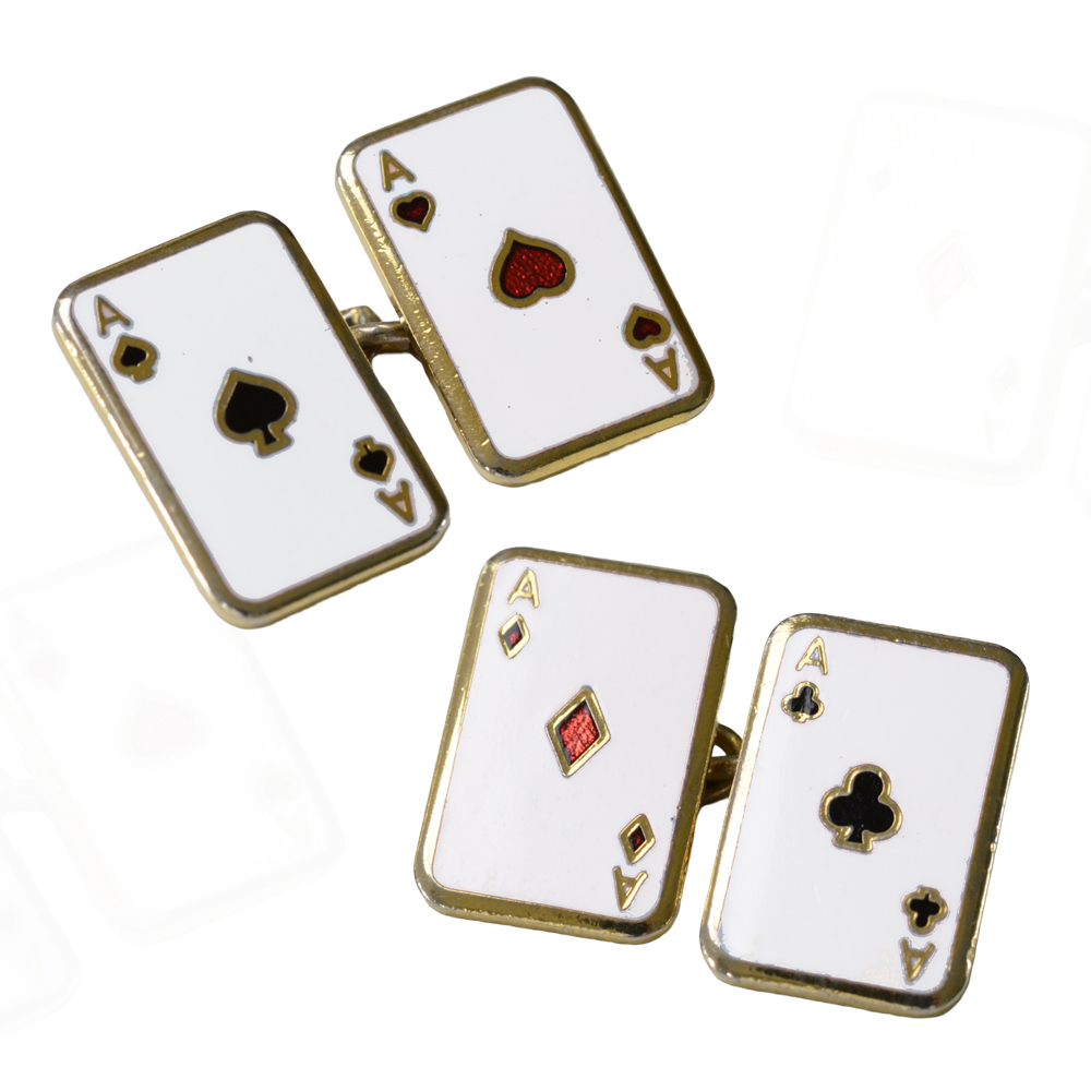 Each face features the ace from one of the four card suits and is crafted with black or red guilloche enamel detail in a white enamel setting with goldtone highlights. These are set in goldtone frames and connect with a five-link chain. Each face measures 17 mm x 11 mm.