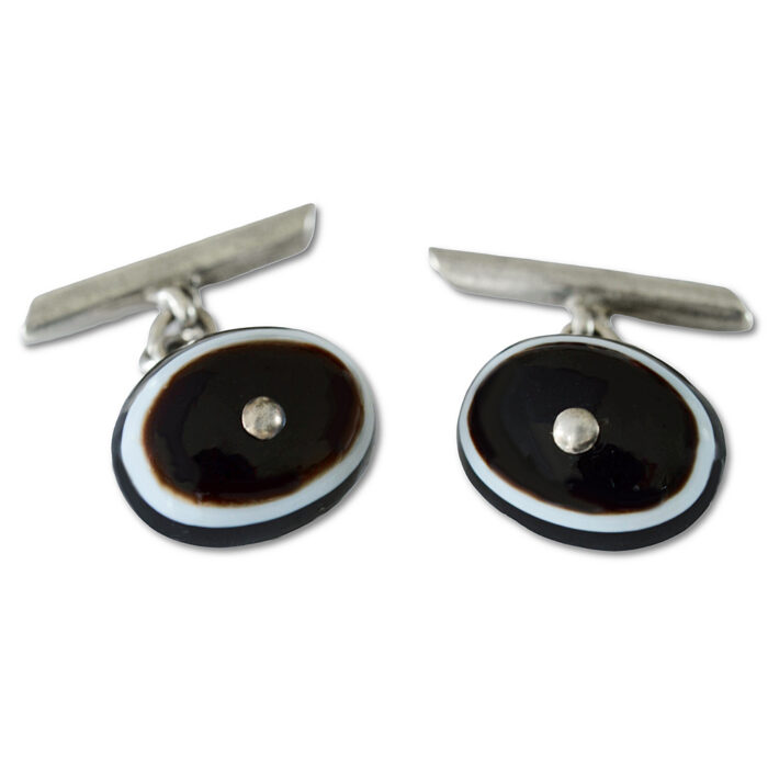 These cufflinks feature a polished banded agate stone in black with hints of dark chocolate brown and a white band. The stones are connected to an unmarked silver bar retainer via a five-link chain and measure approximately 17 mm x 13 mm; the bar is 20 mm long. They date from the early 1900s and are in lovely vintage condition.