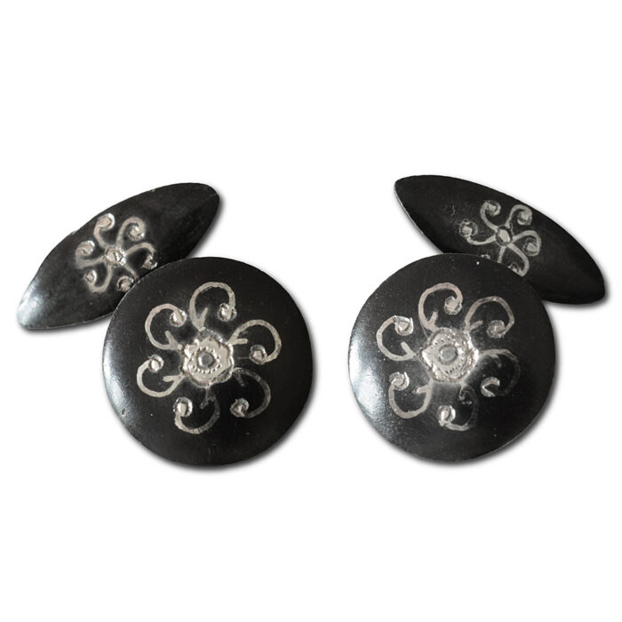 This intriguing pair of cufflinks have an eye-catching design that sets them apart from more conventional accessories. They almost certainly date from the Edwardian era and are made of polished black slate inlaid with a scrolling, foliate pattern in silver.